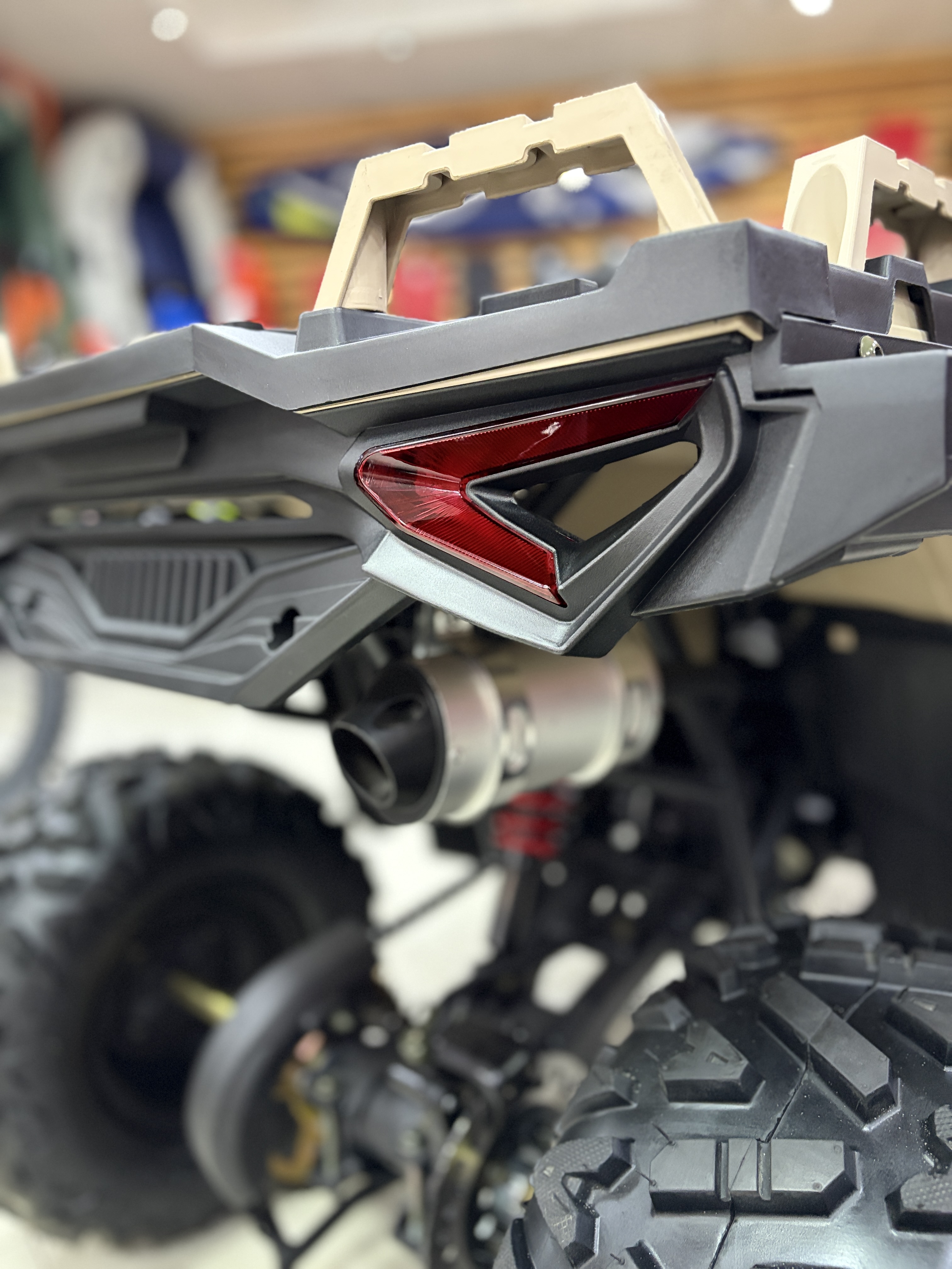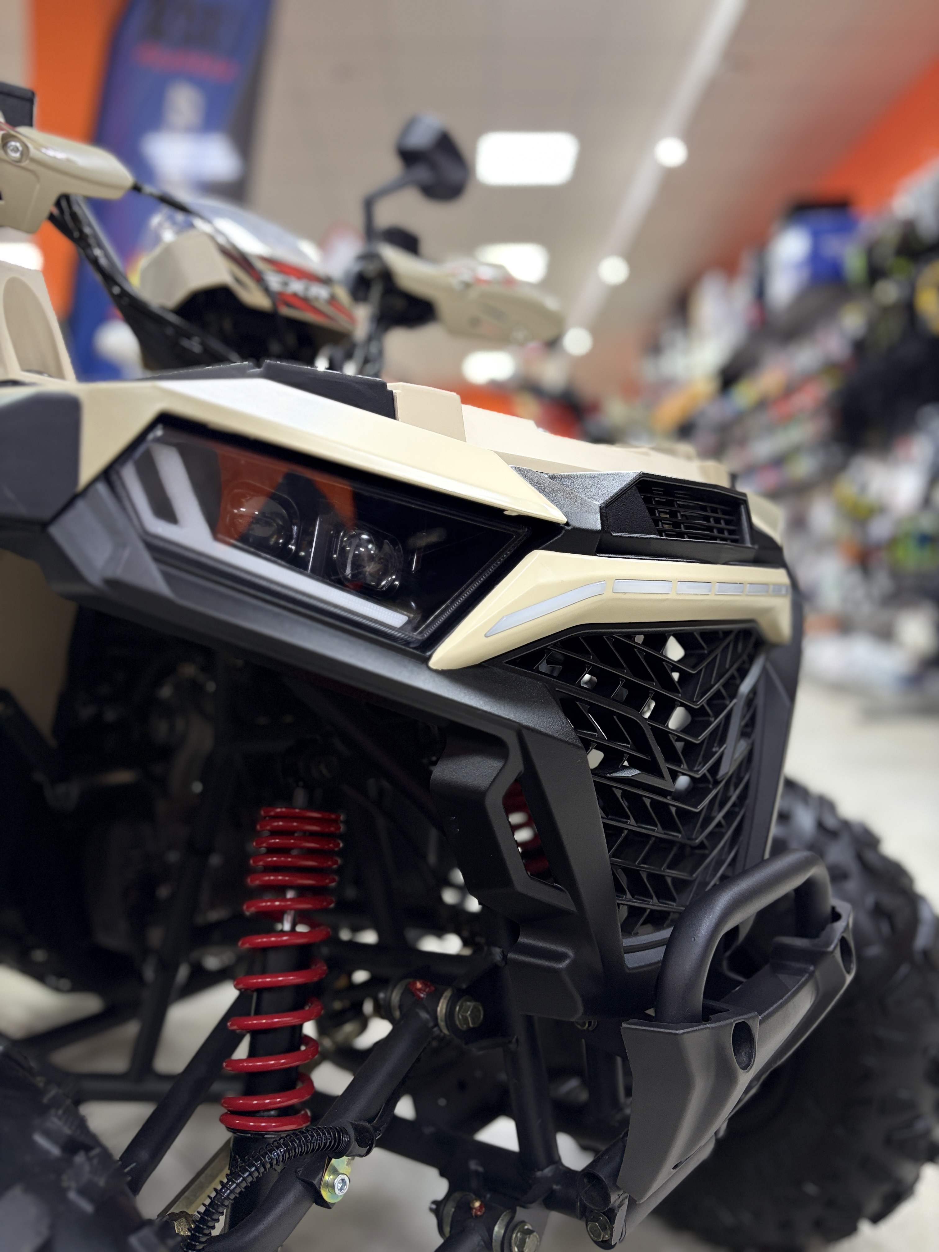 Квадроцикл оснащён всем необходимым для безопасной и увлекательной езды: гидравлические дисковые тормоза на обеих осях, LED-освещение с дневными ходовыми огнями, зеркала заднего вида, защита рук и рама из хроммолибденовой стали.